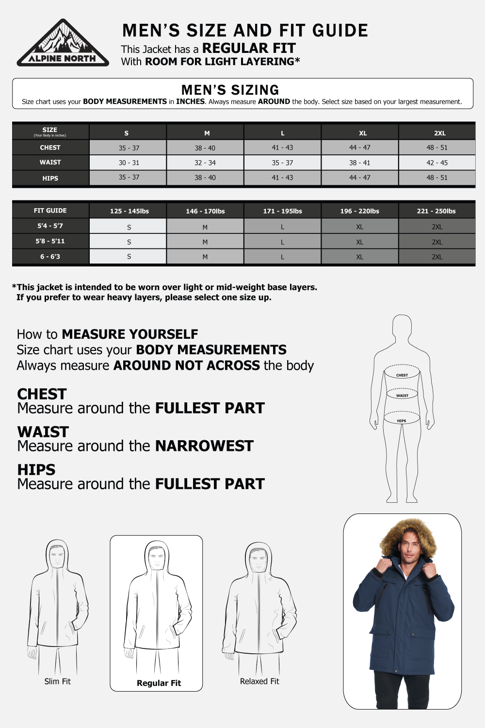 If you usually prefer to wear a light layer under your jacket, you may prefer to size down from your regular size. However, if you enjoy bulkier layers, we recommend choosing your usual size. The model is 6’1” and is wearing a size M.