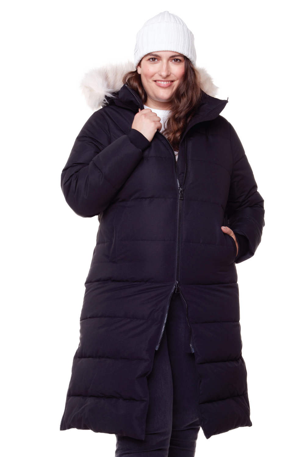 When we say “COLD”, you say “COZY”. Picture it- the coldest day of the year, and you’re outside in the warm embrace of this Plus Size Vegan Down (Recycled) Ultra Long Parka. While you may be the cause of one’s envy, you will certainly not be cold! And that’s what matters right? This is the longest coat in our women’s winter collection, but comfort is key, so it has side-seam zippers and a 2-way front zipper for custom adjusting. Remove the faux fur from the hood for easy washing or remove the hood from the jacket’s collar entirely for a sleek modern look. This coat does it all and has got you covered in -30°C / -22°F. Did we mention it’s 100% Animal-Free and recognized by the Global Recycle Standard (GRS) because it’s fabric is made from 100% recycled plastic bottles?