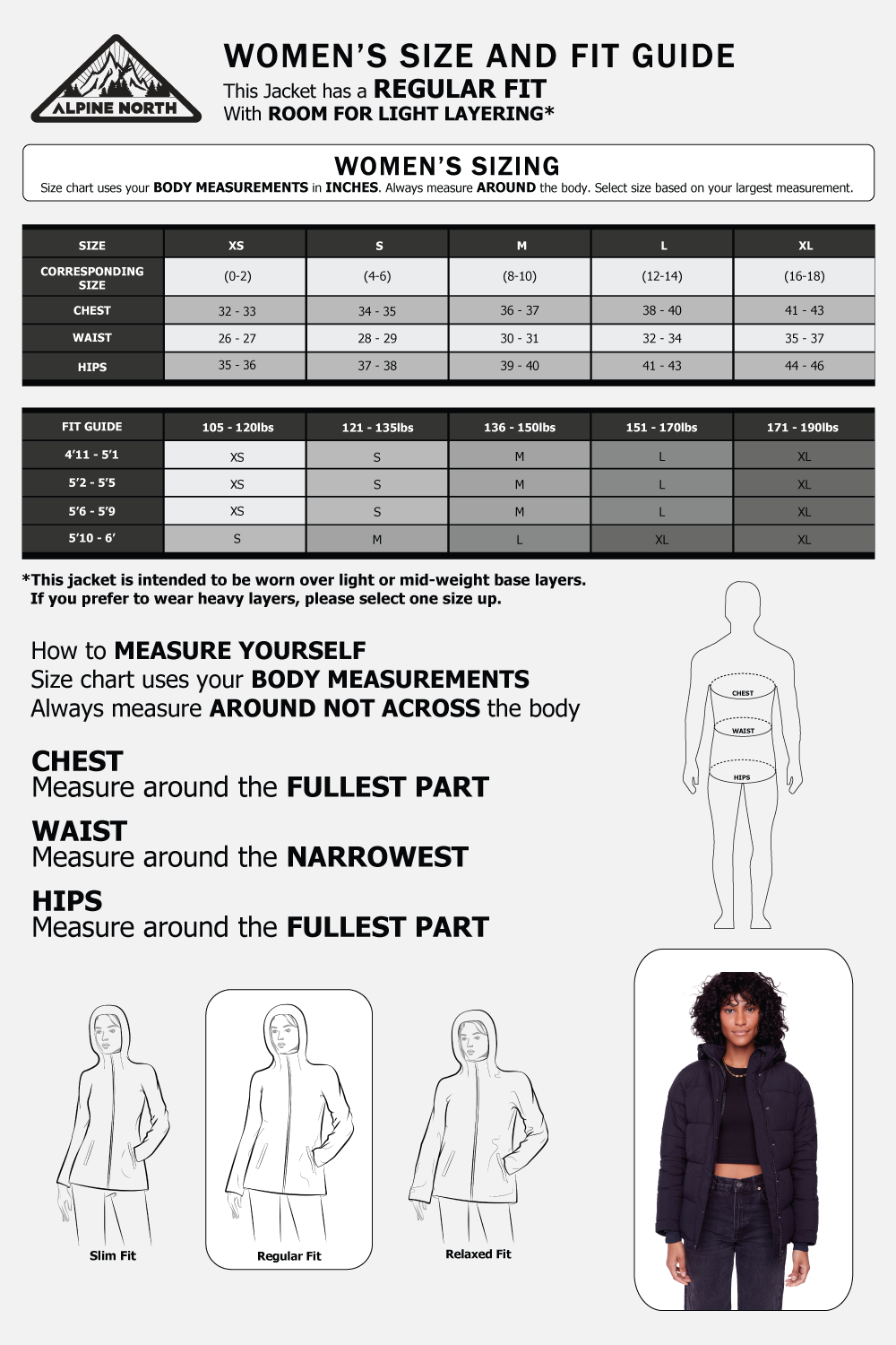 Our jackets are seriously warm, so we have designed them to be worn over light clothing or base layers. If you are someone who loves to layer up with heavier sweaters, we suggest ordering one size up from your normal size.