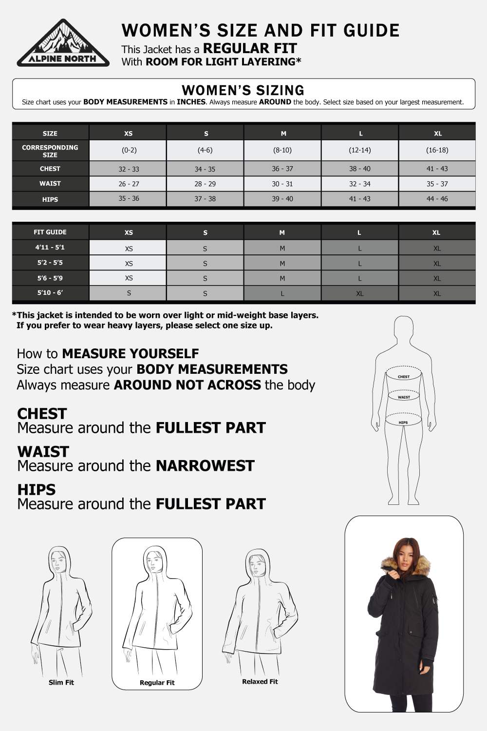 Our jackets are seriously warm, so we have designed them to be worn over light clothing or base layers. If you are someone who loves to layer up with heavier sweaters, we suggest ordering one size up from your normal size.