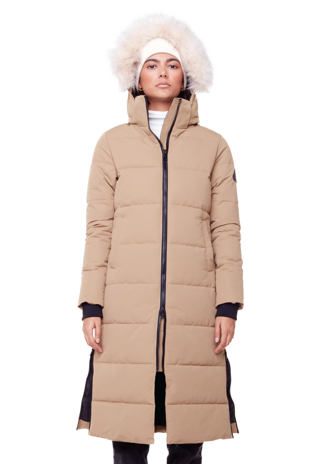 KLUANE | WOMEN'S VEGAN DOWN (RECYCLED) ULTRA LONG LENGTH PARKA, CAMEL